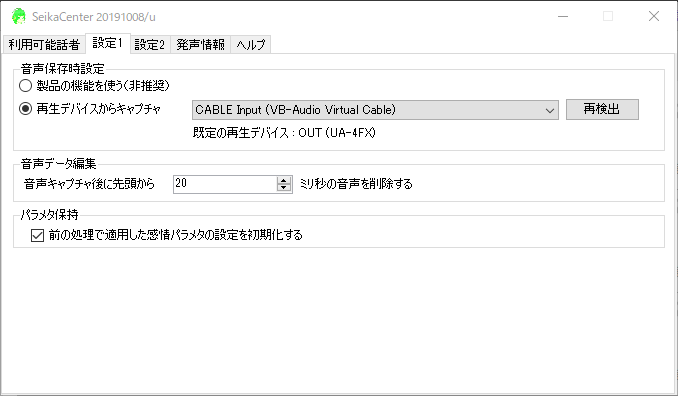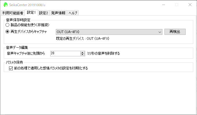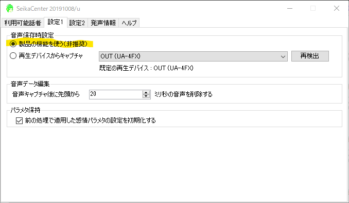 音声合成製品、SeikaCenter共に「既定のデバイス」に合わせてください。この例ですと“OUT(UA-4FX)“が既定のデバイスと言う事になります。