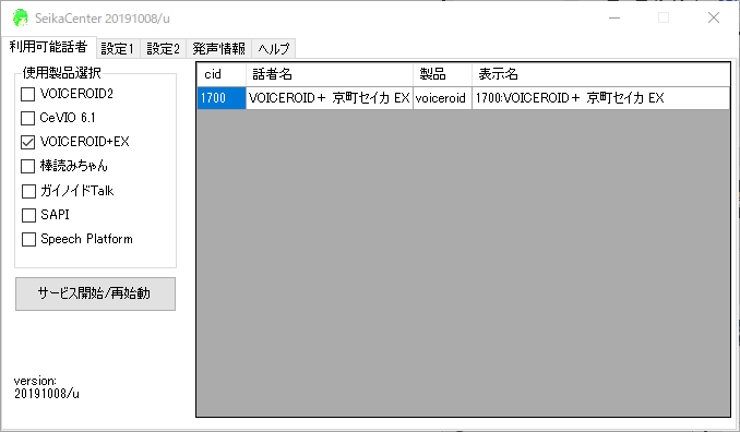 音声合成製品(VOICEROID+EX、VOICEROID2、ガイノイドTalk、CeVIO、棒読みちゃん)のデバイス設定と、SeikaCenterのデバイス設定は一致させてください。一致していないと音声保存できません。