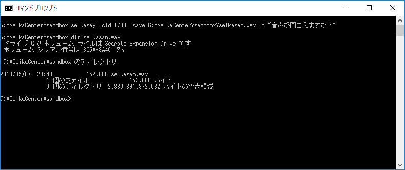 SeikaCenterと音声合成製品のデバイスの設定が済んだら、SeikaCenterアーカイブに同梱されている seikasay.exe で音声が保存できることを確認してください。
