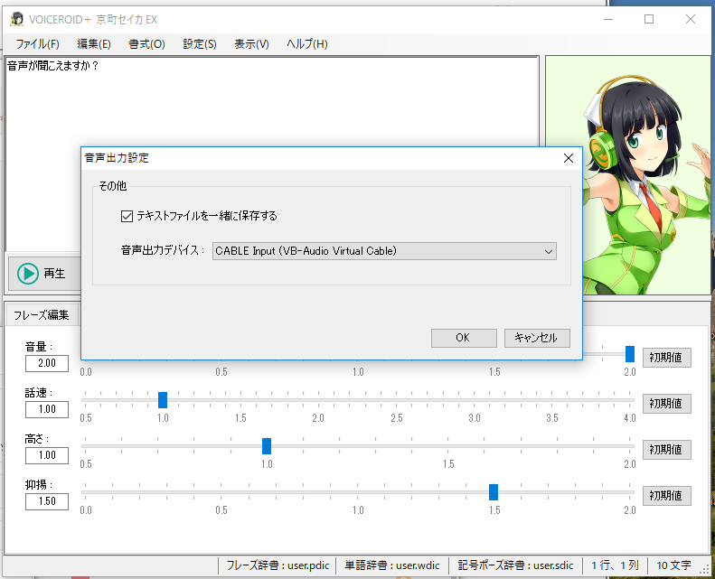 この例では、デバイス”CABLE Input(VB-Audio Virtual Cable)“へ出力するよう設定しています。seikasay.exe で音声保存を試して、保存ができる事を確認してください。