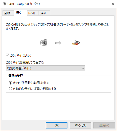 デバイスのプロパティの「聴く」のタブに「このデバイスを聴く」のチェックがあるのでこれを有効にし、再生デバイスを「既定の再生デバイス」にします。
