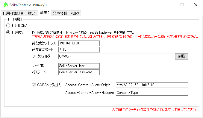 - 待ち受けアドレスには、SeikaCenterを実行しているPCに割り当てたIPアドレスを入力します。この例では “192.168.1.100” になっています。
